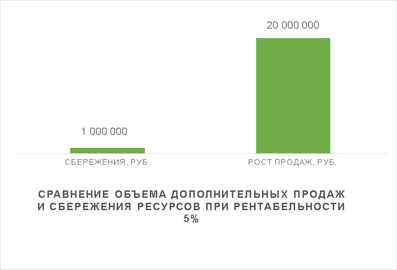 Экономия 1 млн. рублей на энергоресурсах даёт тот же финансовый результат — без увеличения объёма продаж. Экологические выгоды являются неотъемлемой частью снижения затрат и маркетинговым активом.
